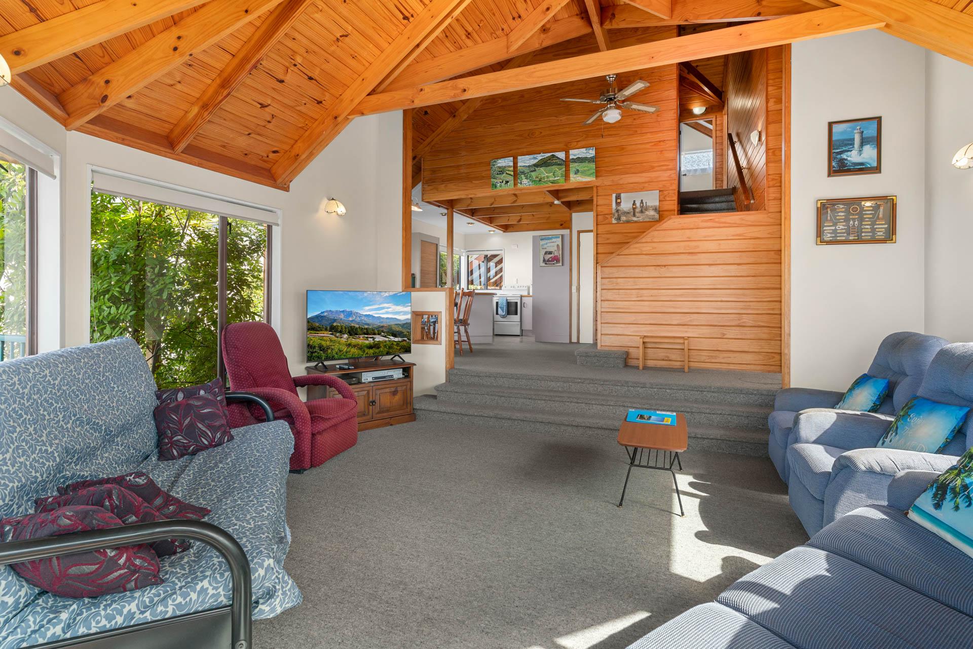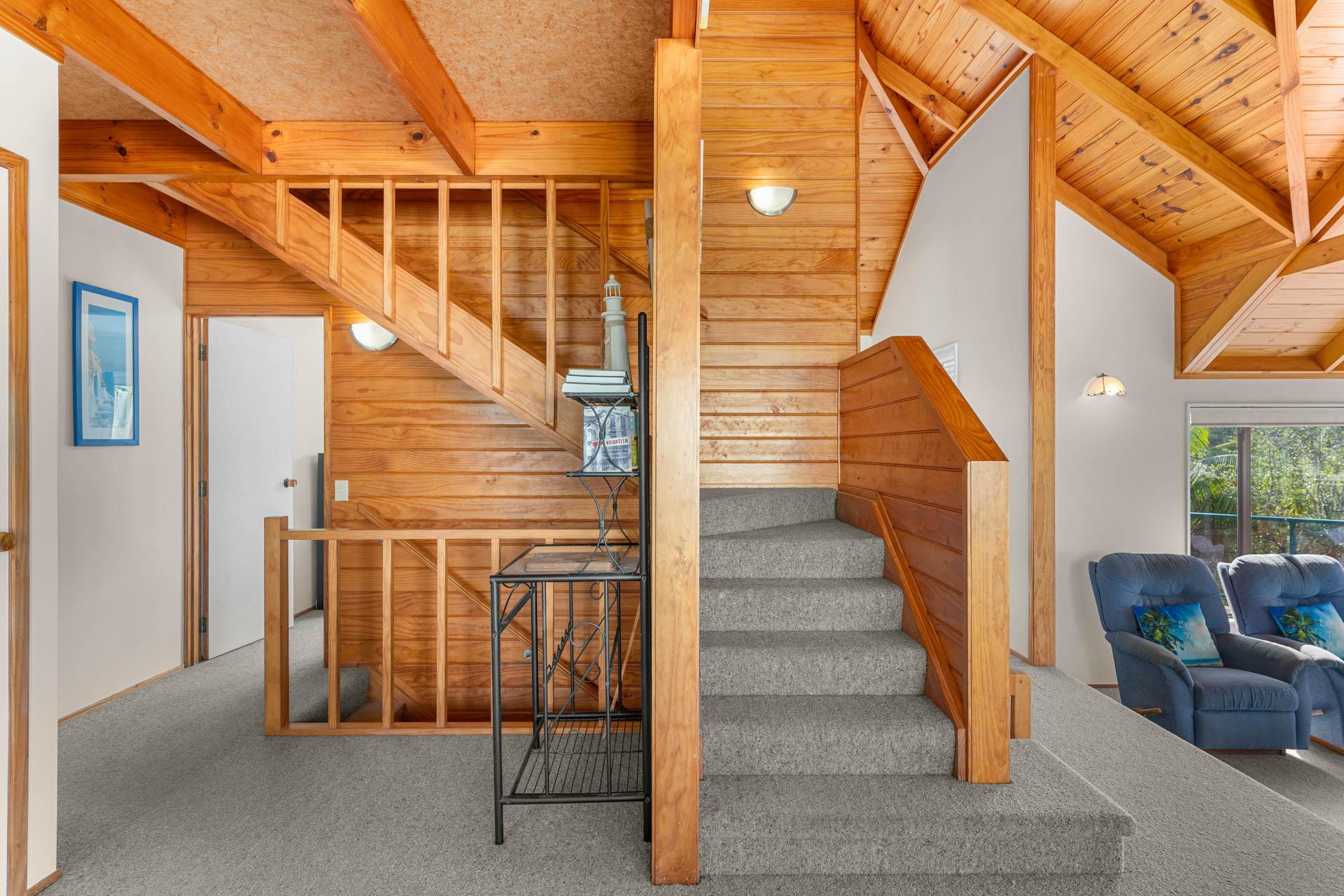 The 3 bedroom, 2 bathroom house, has a large open plan living/dining/kitchen which flows out onto the large deck. The house is set on predominantly 2 levels and several of the decks afford views out to the water. Upstairs, there are 2 bedrooms - one with a Queen, and the other with 2 King Singles and 2 Singles - along with 1 bathroom. Downstairs, there is a third bedroom with a Queen, along with 1 other bathroom. It is an older house but has been well looked after and provides comfortable living with all the basics you need for a family holiday.