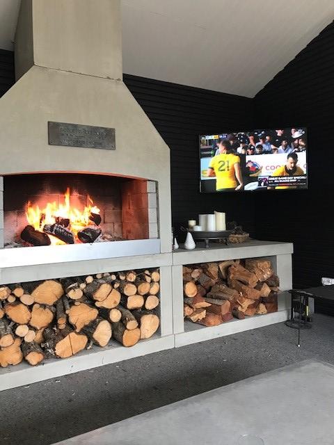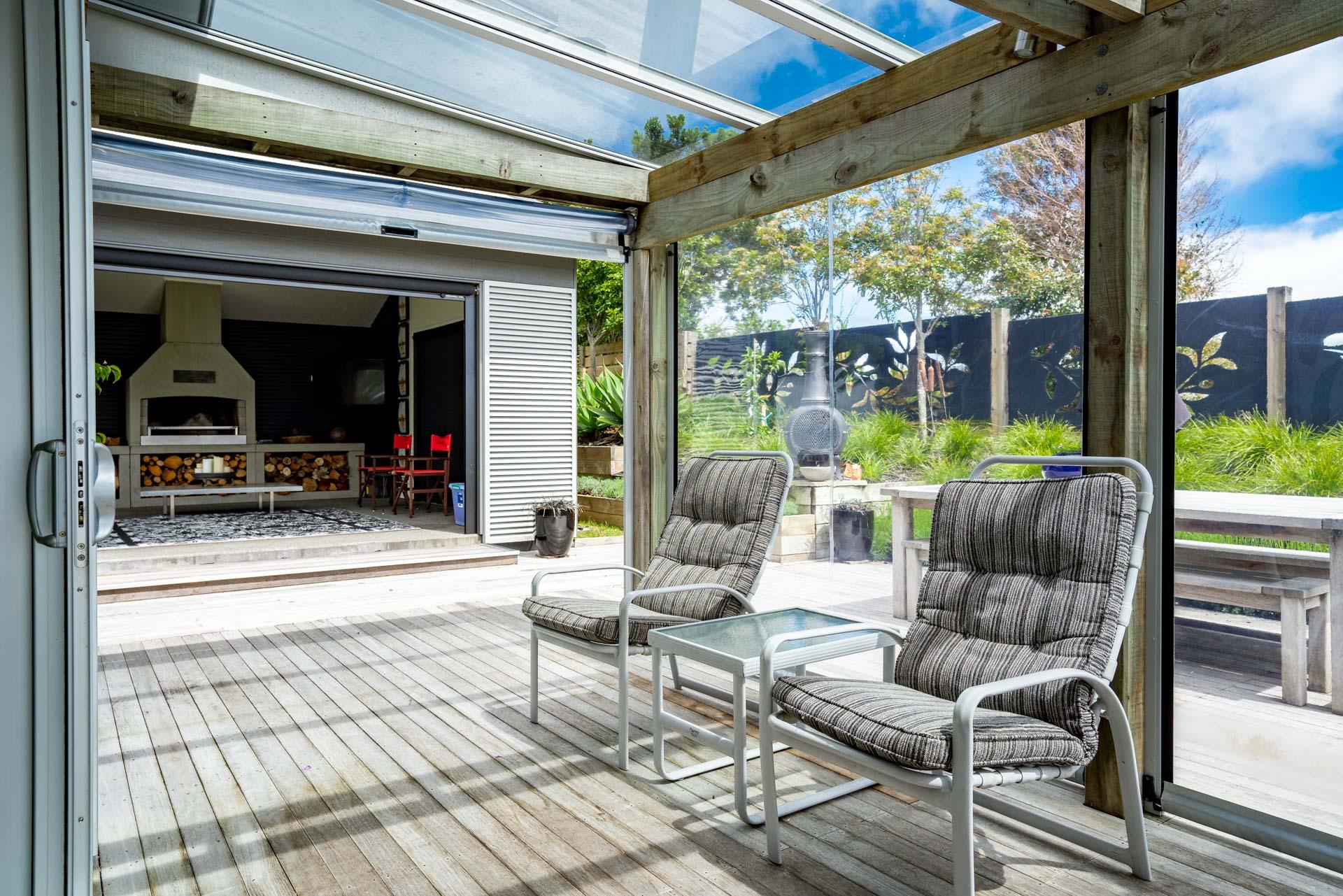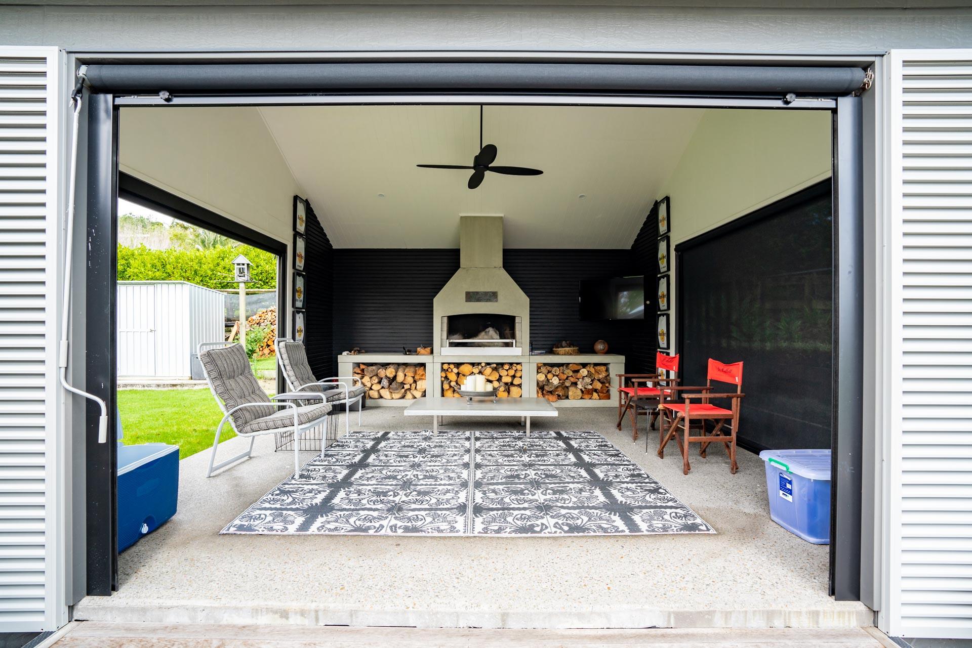 The modern, fully equipped kitchen flows seamlessly into the open-plan living area and out onto a spacious, covered deck—ideal for al fresco dining in any weather, thanks to convenient roller blinds. There's also a unique 'fire room' with a large-screen TV, offering a cozy and inviting space for entertaining, no matter the season.