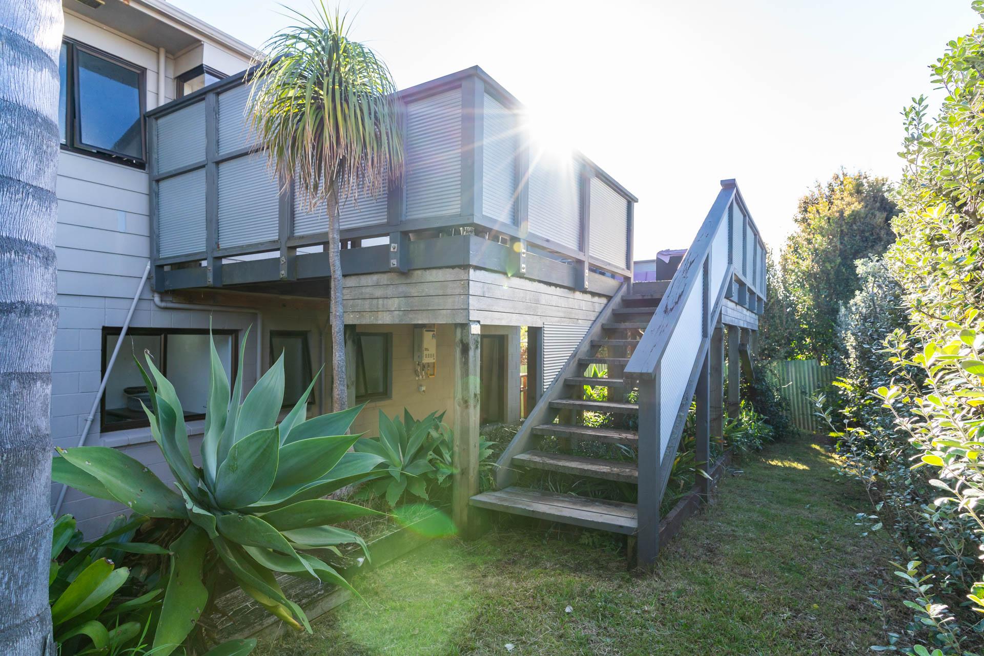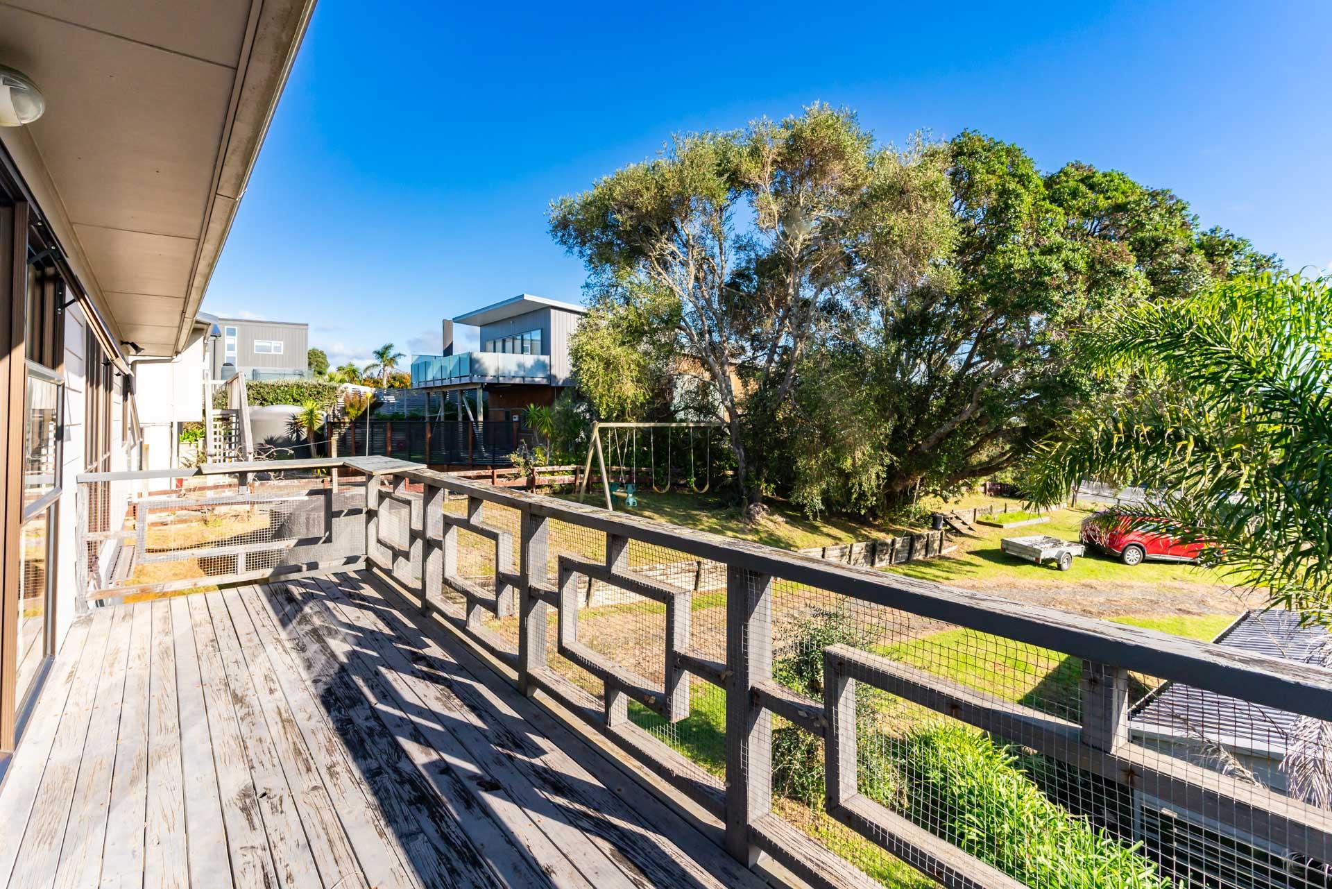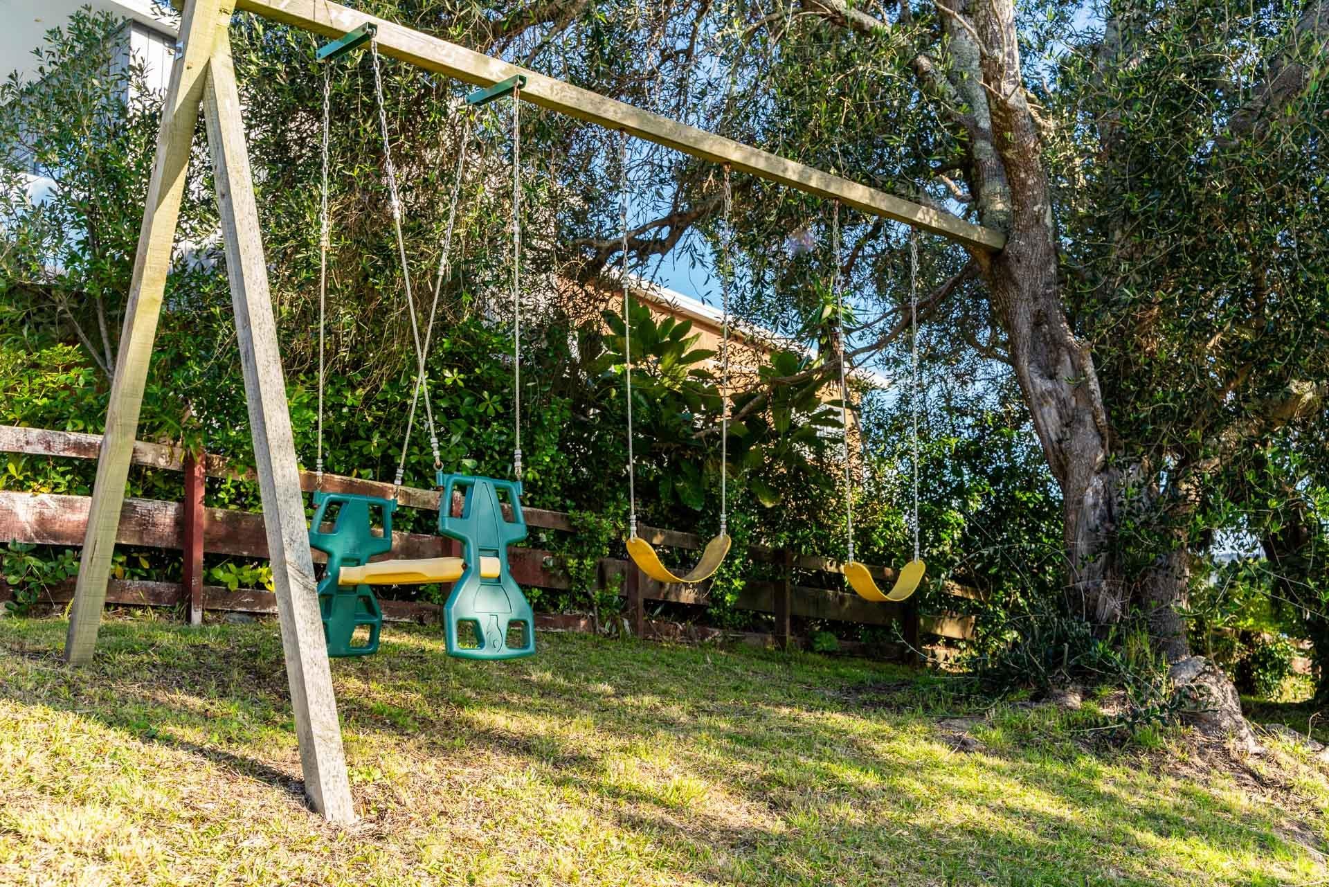 The spacious front lawn provides plenty of room for parking and summer games, with a set of swings nestled among olive and pohutukawa trees—ideal for keeping little ones entertained. A single secure garage adds extra convenience, whether you're bringing bikes, boards, or beach gear.
