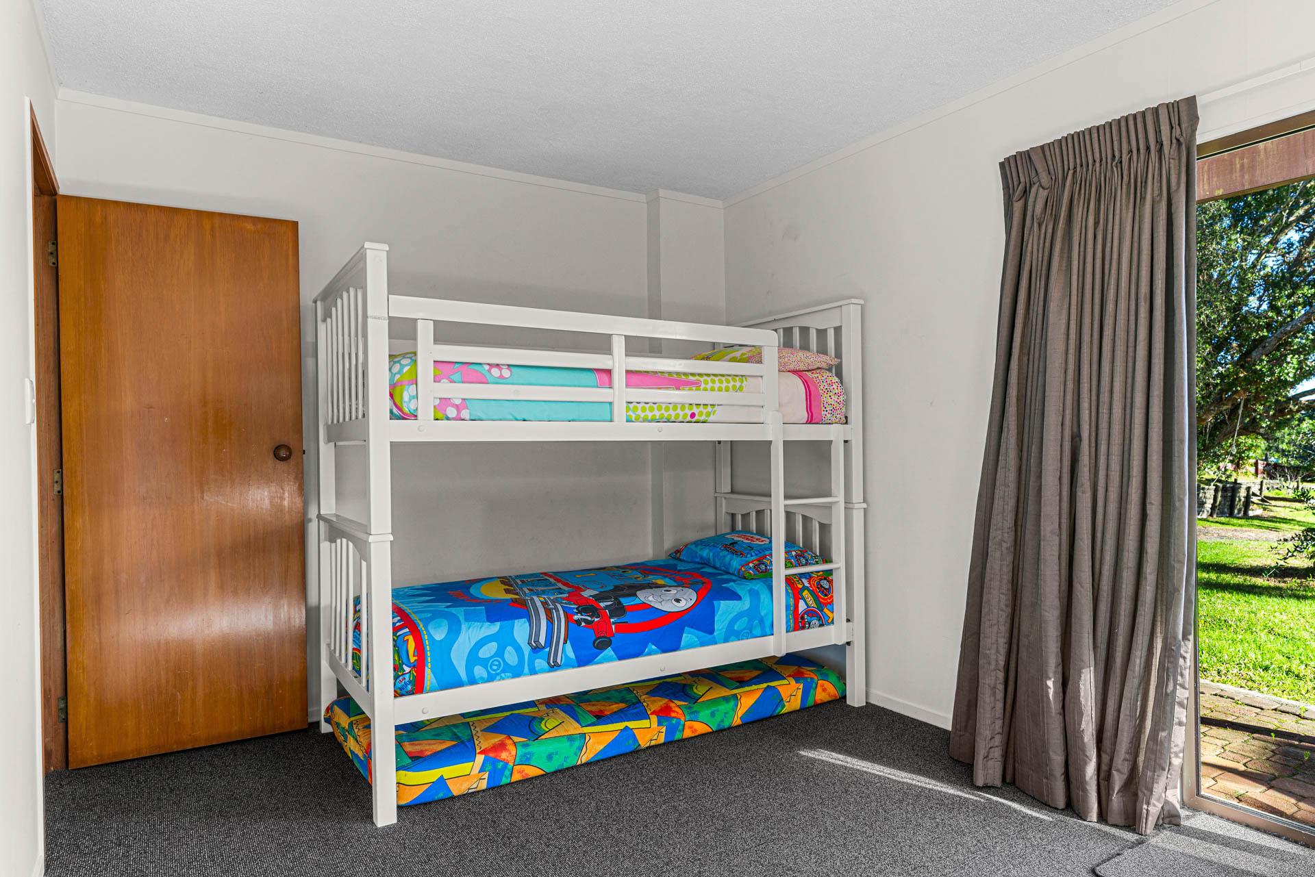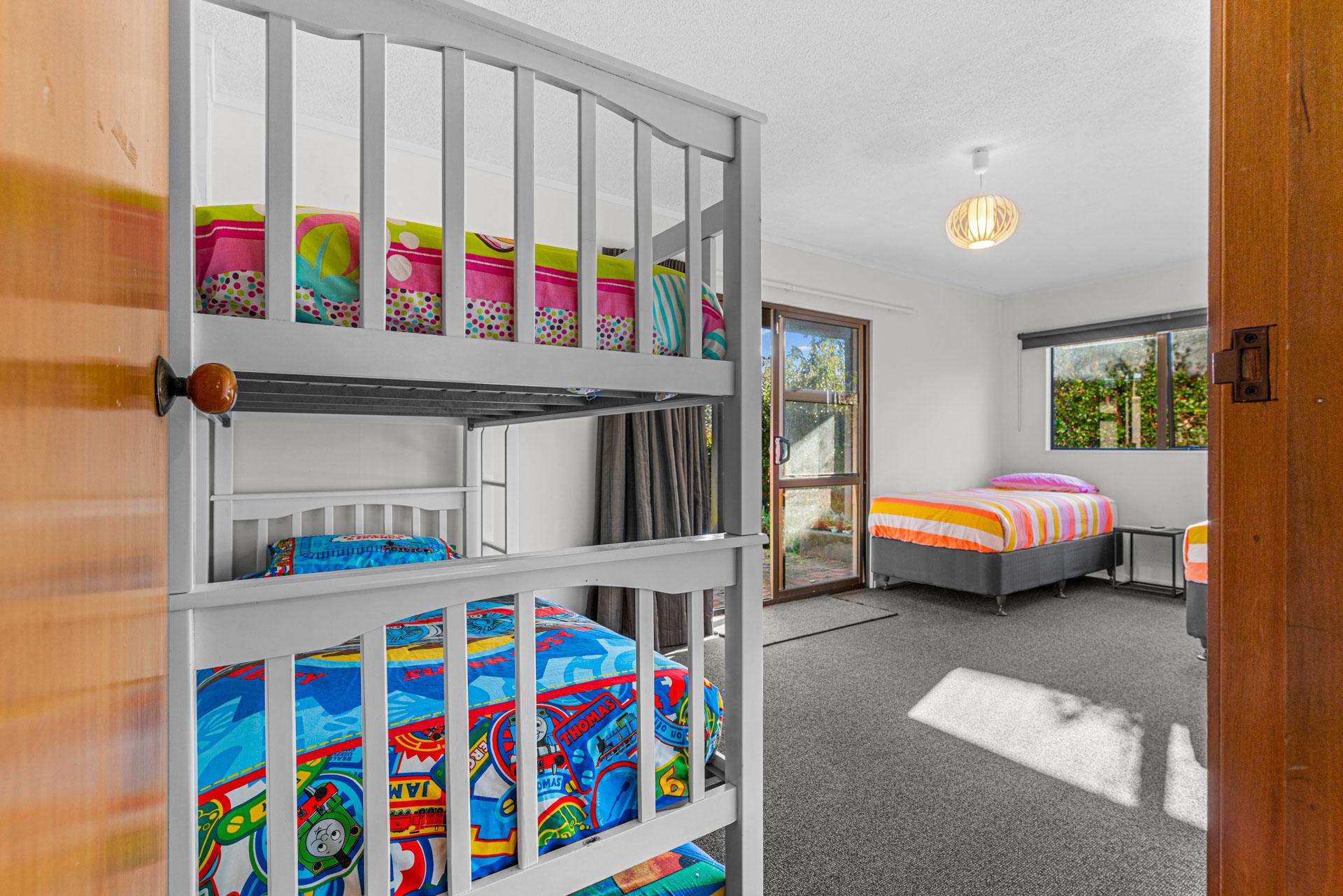 Inside, the bach features four bedrooms—two with king beds, one with a queen, and a fun bunk room that sleeps four—along with two modern bathrooms (one on each level). The fully equipped kitchen and comfortable living areas make it easy to settle in and enjoy your stay.