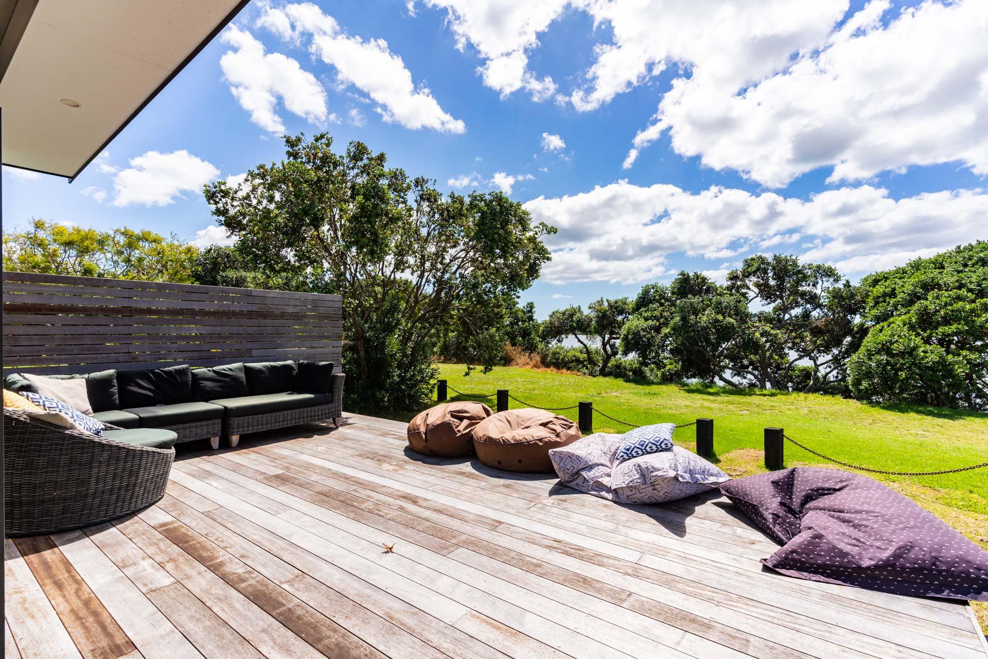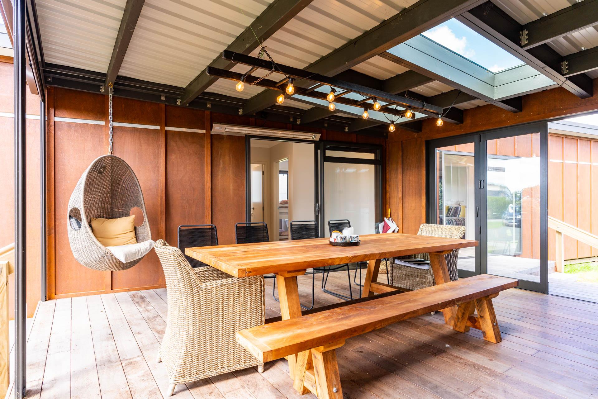 The house itself is split into two parts with an enclosed breezeway between. On one side is a lovely open plan living/dining/kitchen space which leads out onto a large deck overlooking the estuary. In addition, it incorporates the master bedroom with a Super King as well as an ensuite and laundry. On the other side are the remaining three bedrooms - one with a Queen, one with a King, and a kids room with 2 sets of Single Bunks. This side also features another bathroom, separate toilet and second living area. The breezeway is a great spot for dining and relaxing, on warm summer days it provides some welcome relief from the sun, on cooler days slide down the blinds and put on the outdoor heaters to keep things cosy.