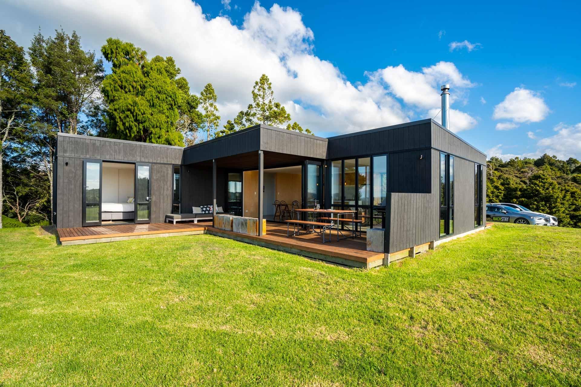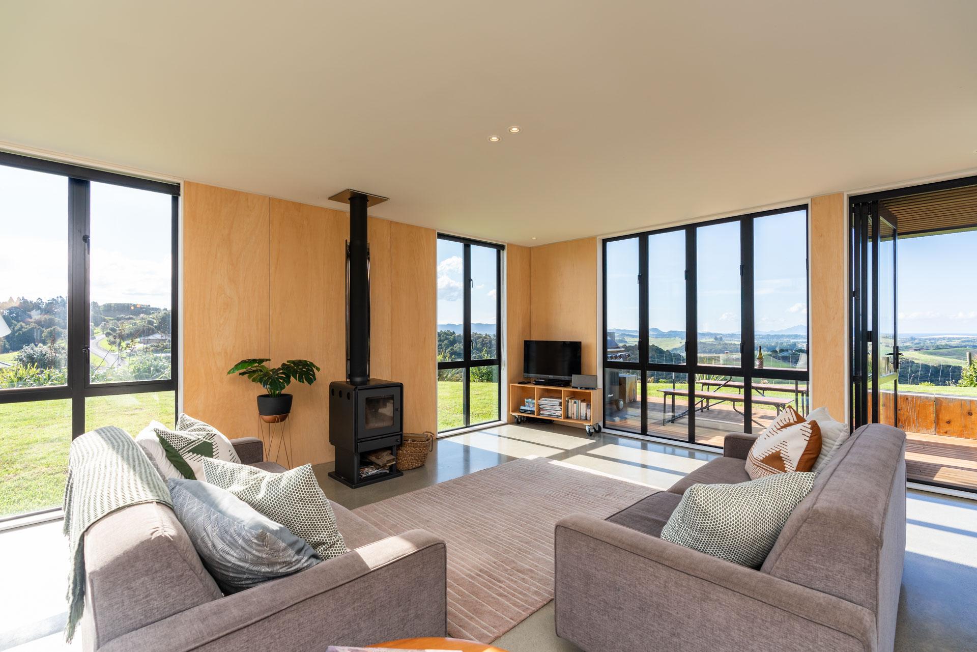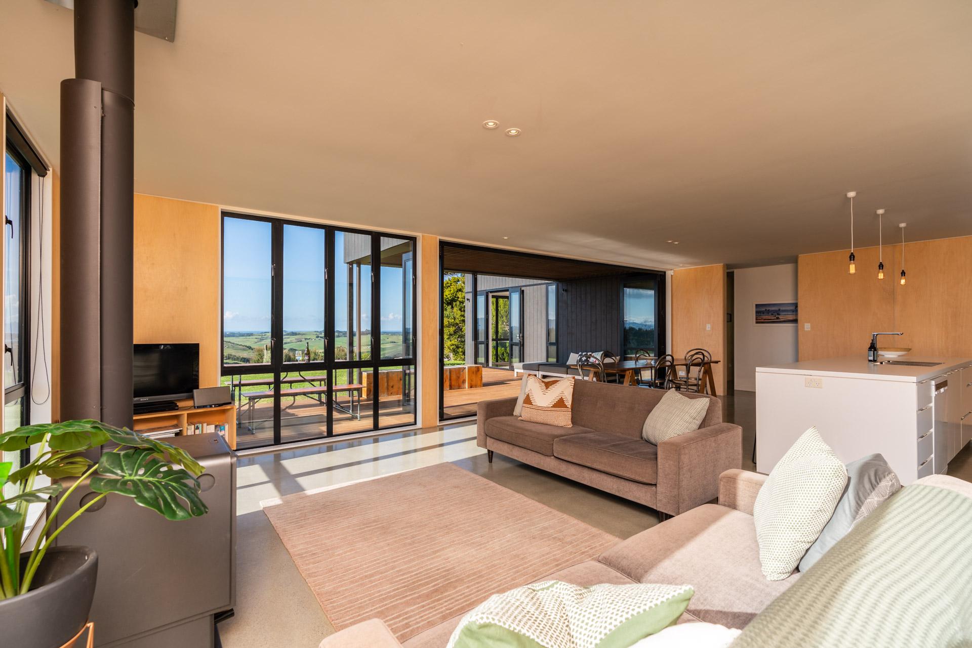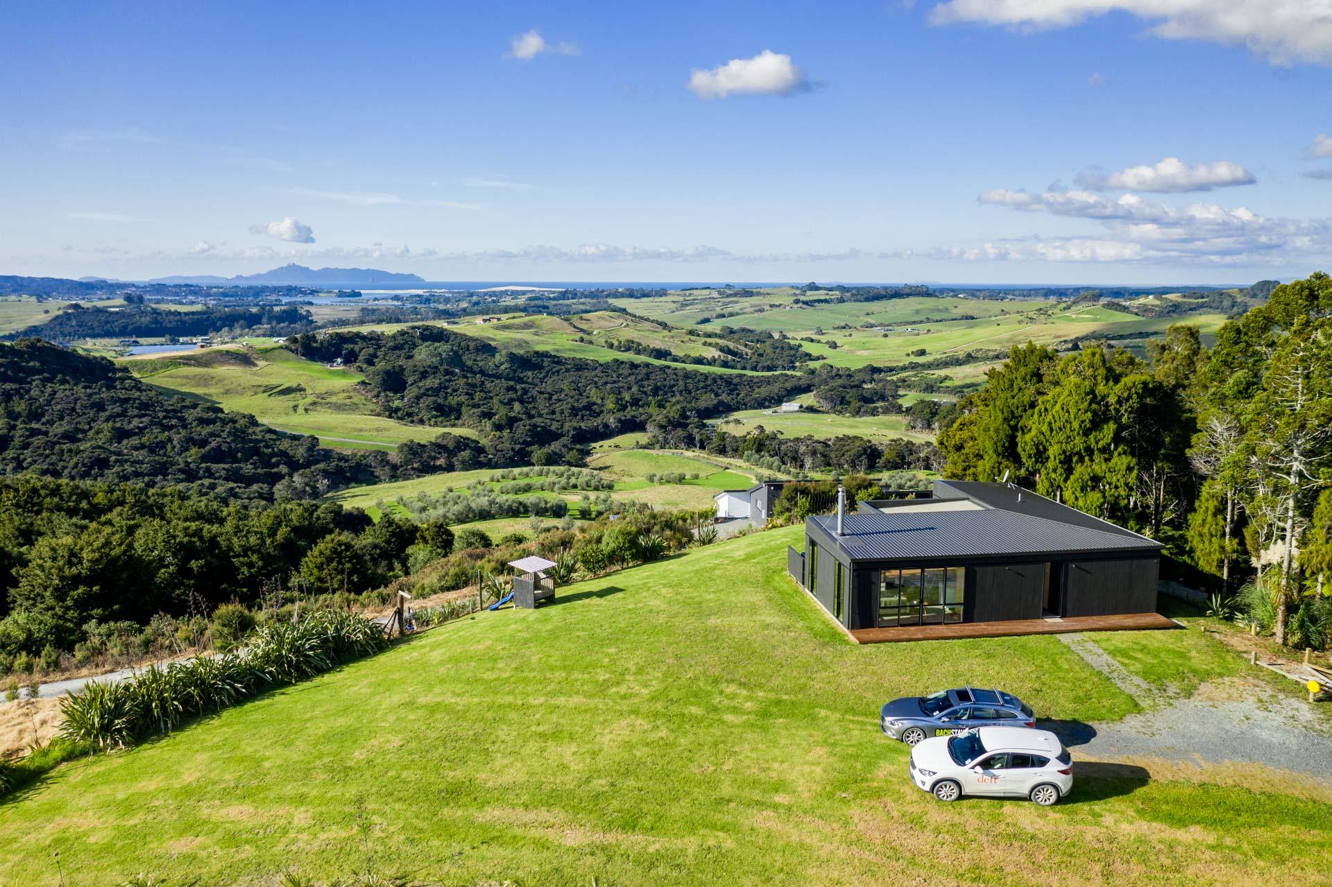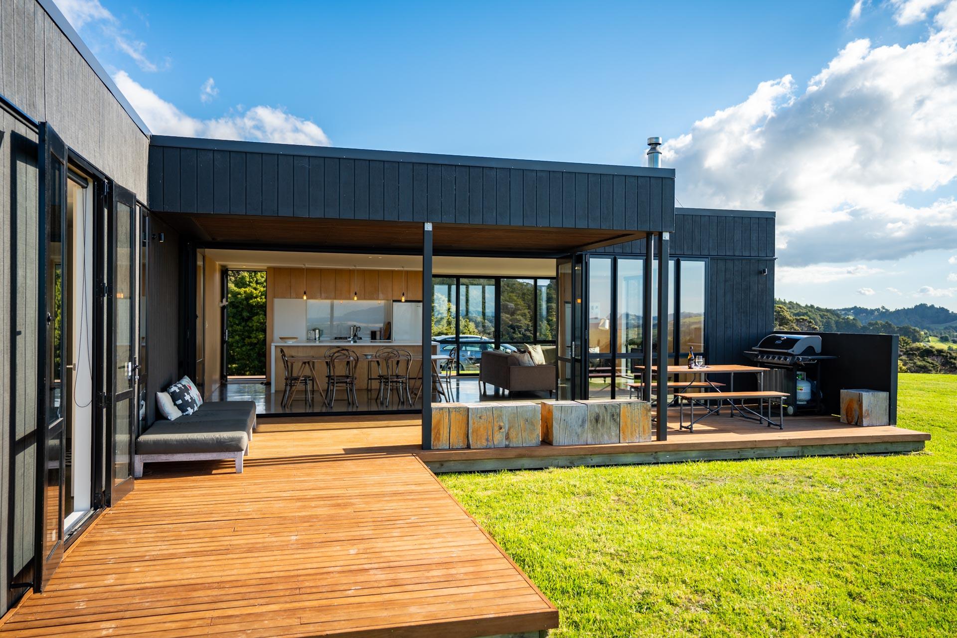 This near new holiday home designed by architect Tim Dorrington offers all the mod-cons of a modern bach but in a peaceful rural setting. Nestled into native bush with mature kauri and totara on one side, the property faces out to panoramic views of the Mangawhai Harbour & valley, the Hen and Chicken Islands and the sparkling Pacific Ocean.