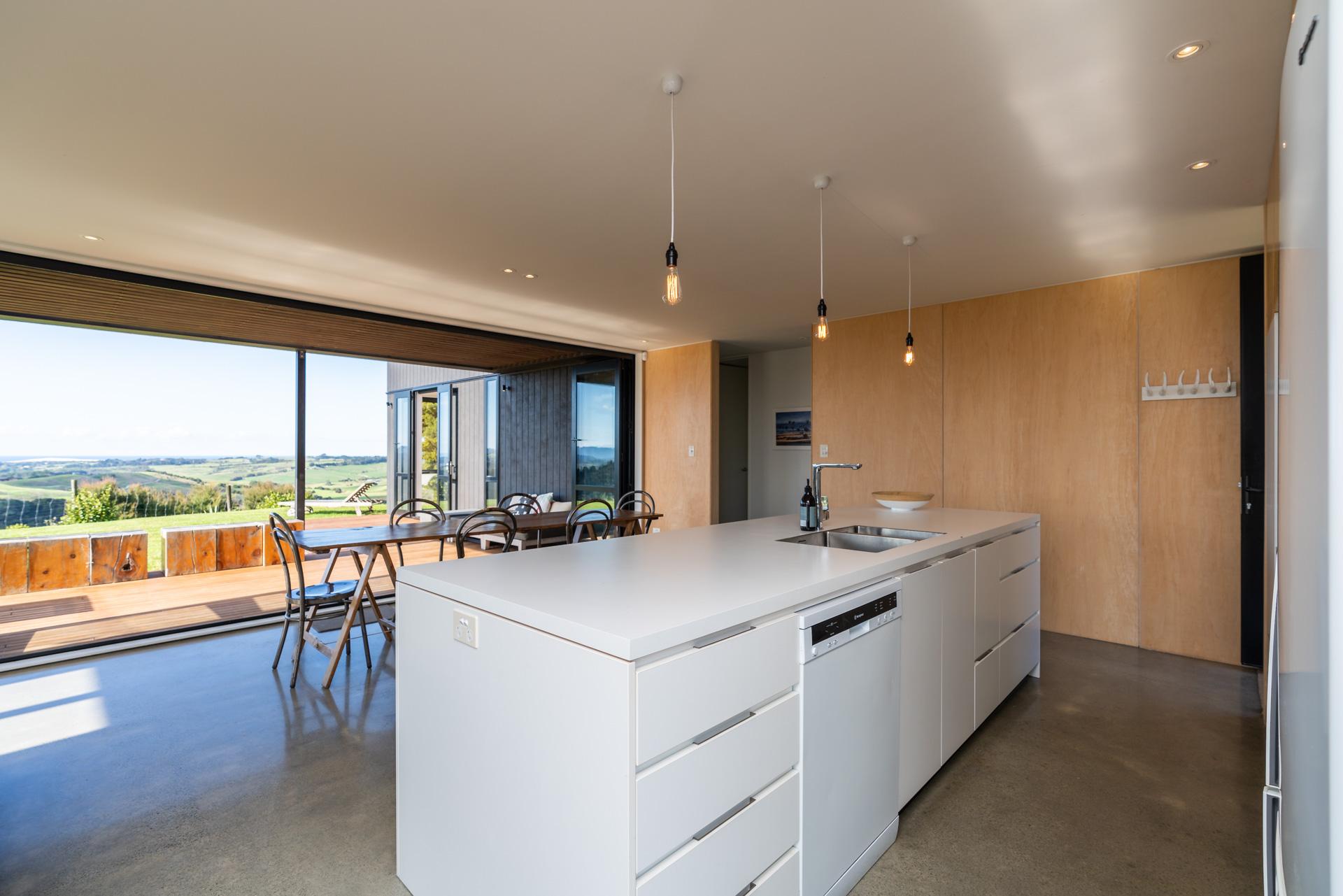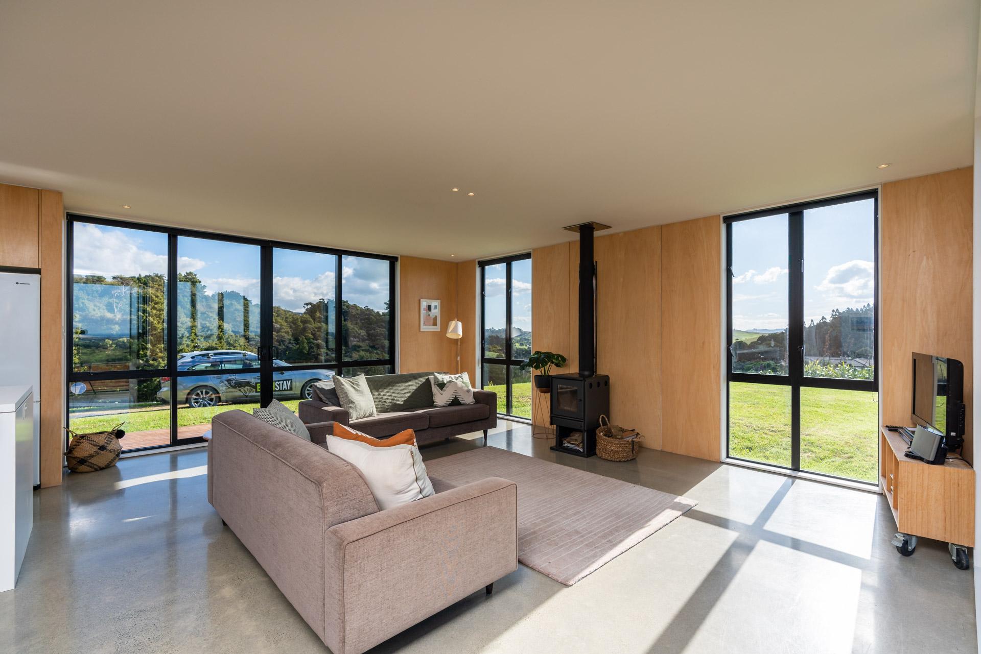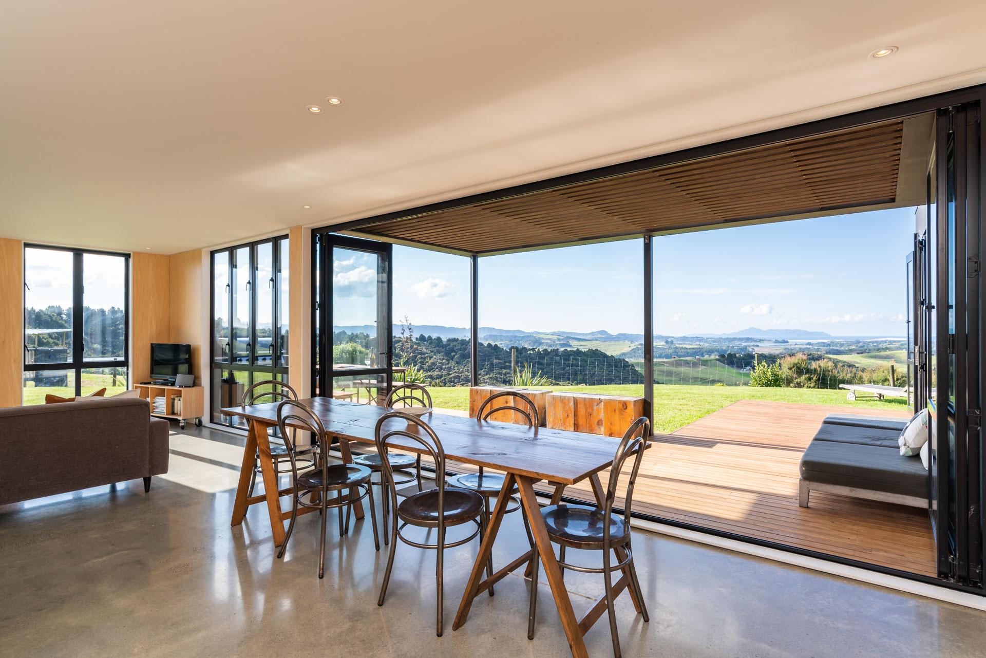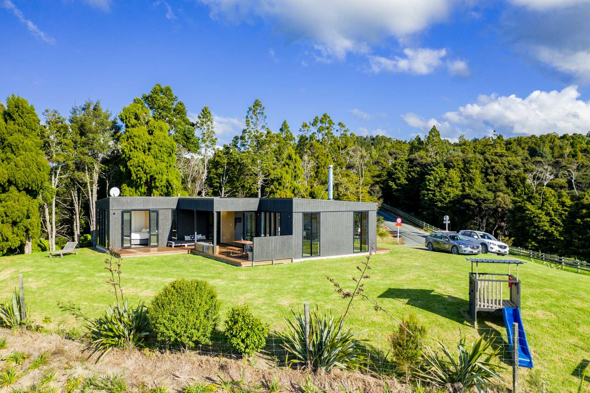 This near new holiday home designed by architect Tim Dorrington offers all the mod-cons of a modern bach but in a peaceful rural setting. Nestled into native bush with mature kauri and totara on one side, the property faces out to panoramic views of the Mangawhai Harbour & valley, the Hen and Chicken Islands and the sparkling Pacific Ocean.