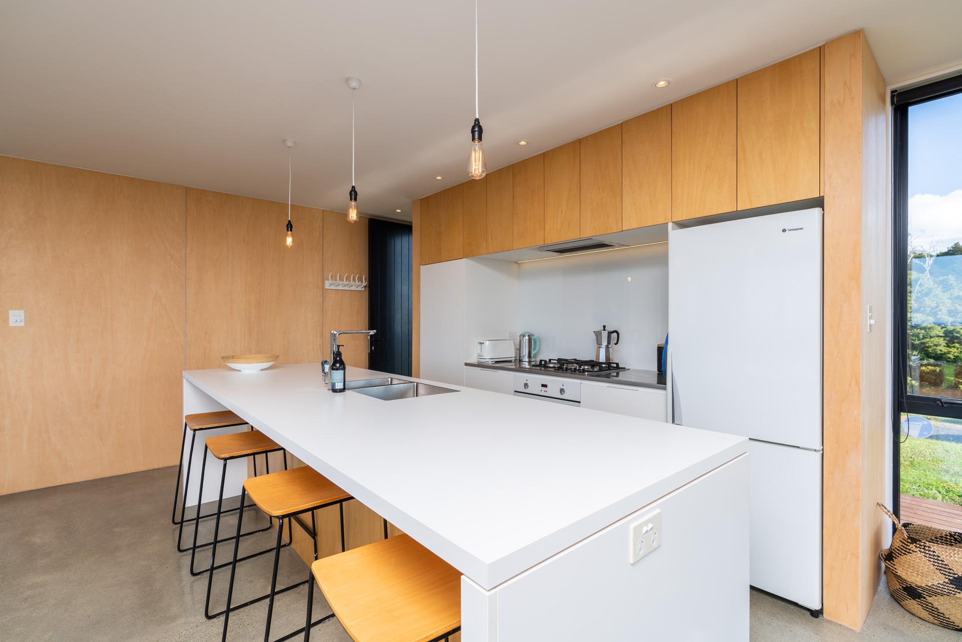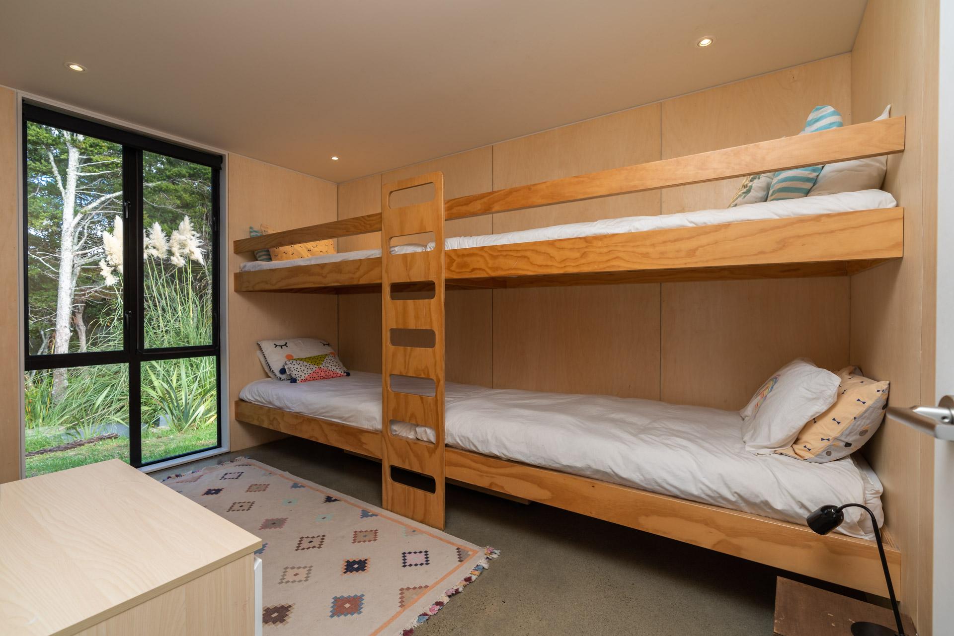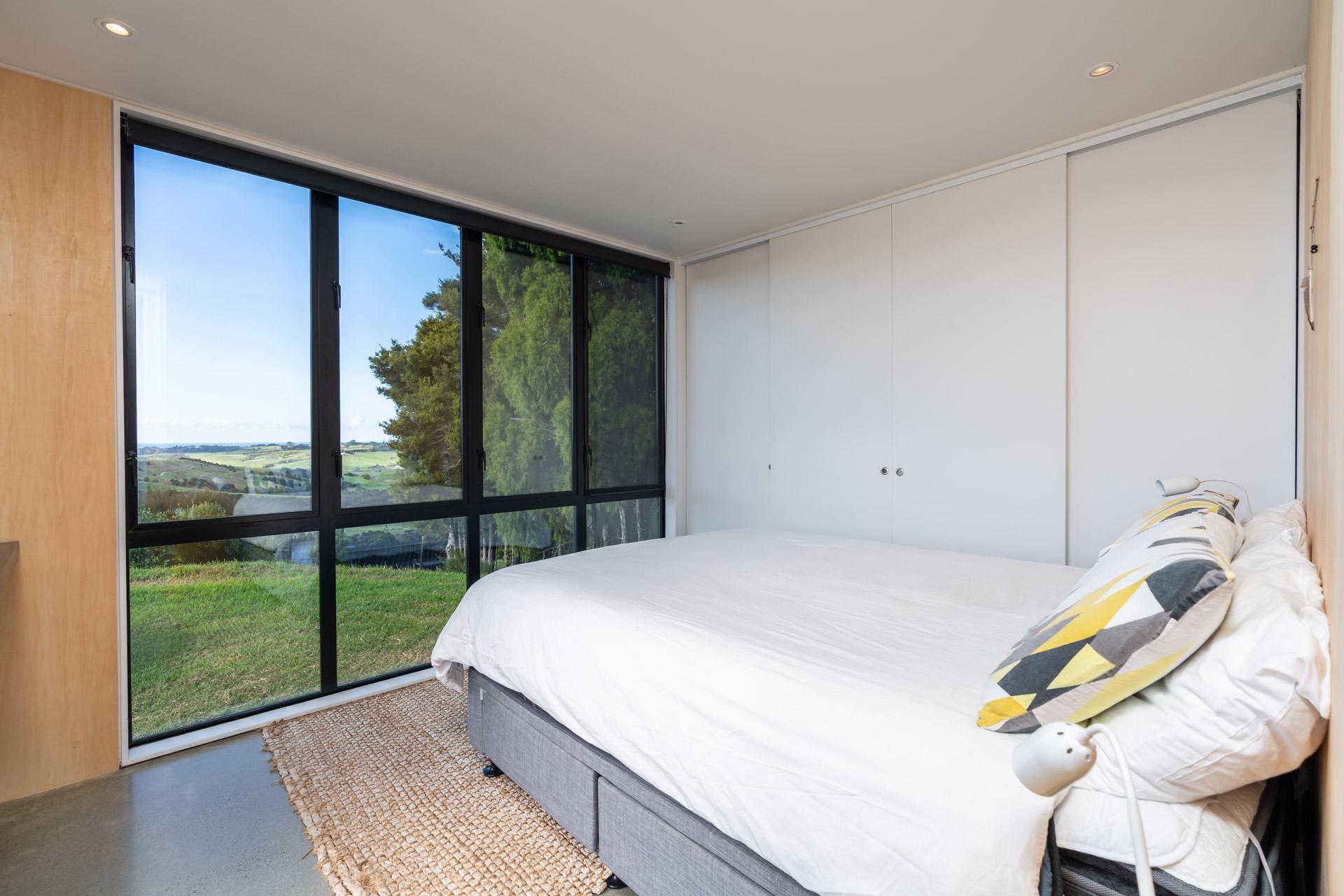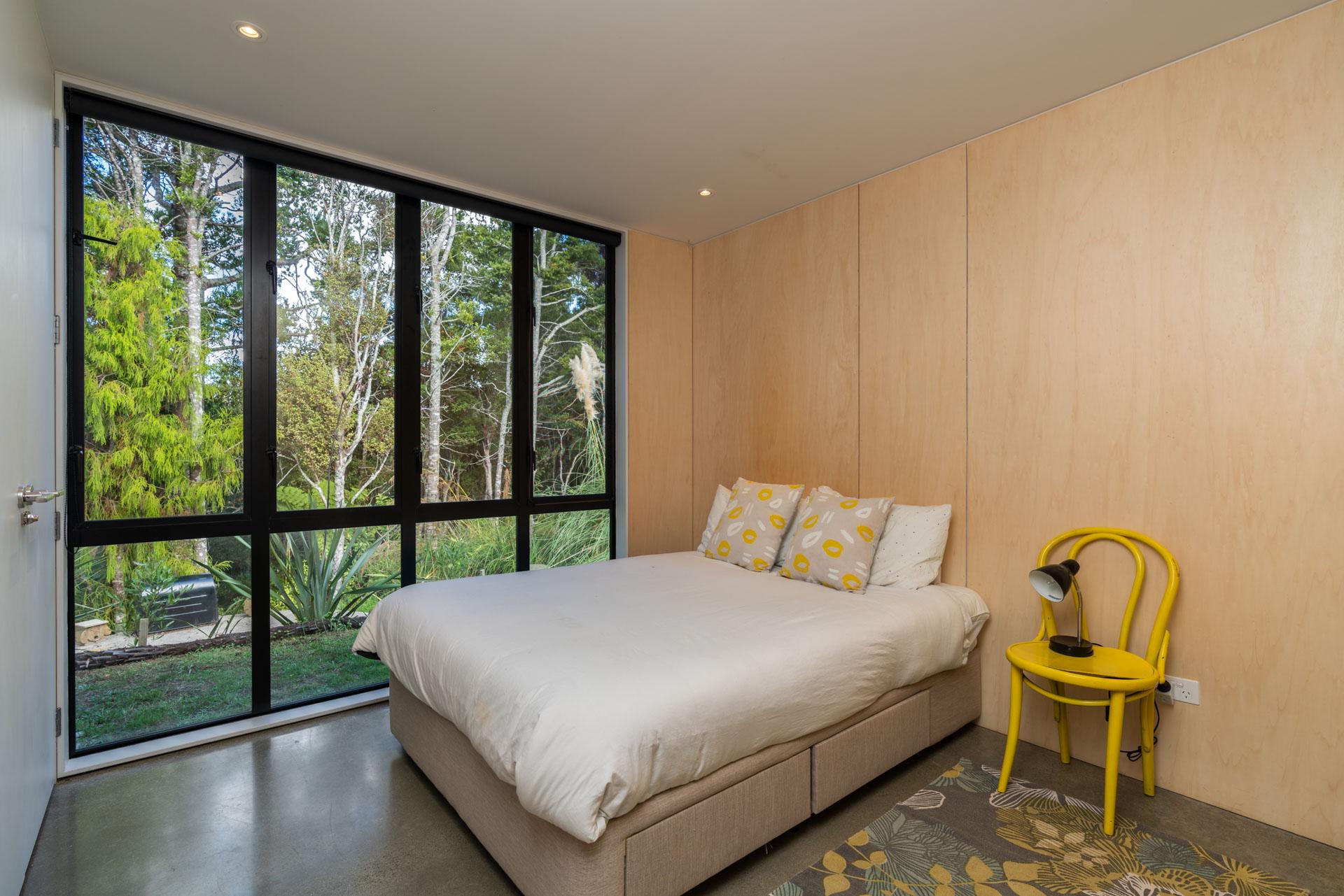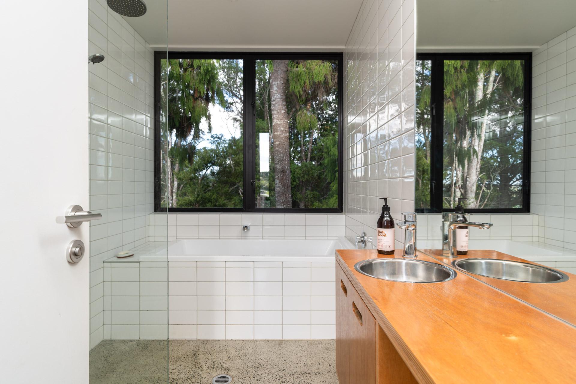 This near new holiday home designed by architect Tim Dorrington offers all the mod-cons of a modern bach but in a peaceful rural setting. Nestled into native bush with mature kauri and totara on one side, the property faces out to panoramic views of the Mangawhai Harbour & valley, the Hen and Chicken Islands and the sparkling Pacific Ocean.